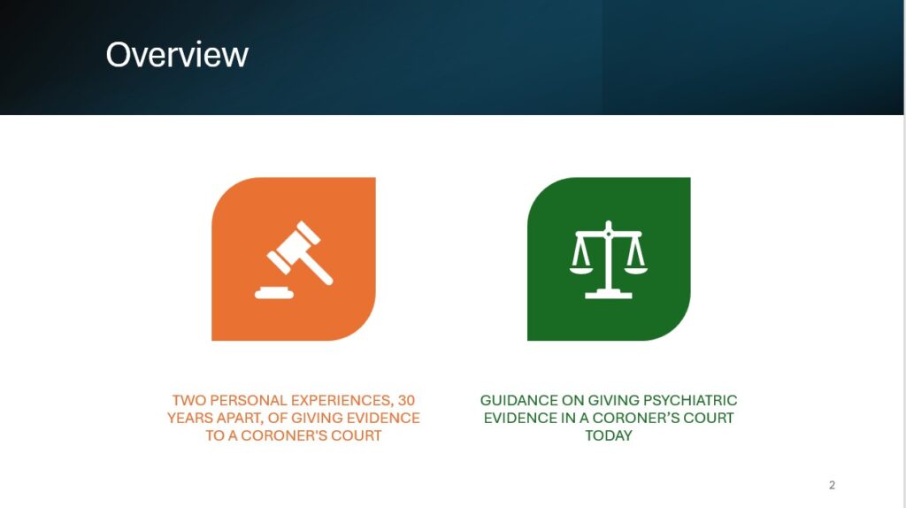 This talk delivered on 13/01/2026, to senior resident doctors and early career consultants working in HPFT focused on the key good practice points to be followed when preparing to give evidence in coroners’ courts. Drawing on two personal experiences, 30 years apart, the session focused on published guidelines and personal reflections.